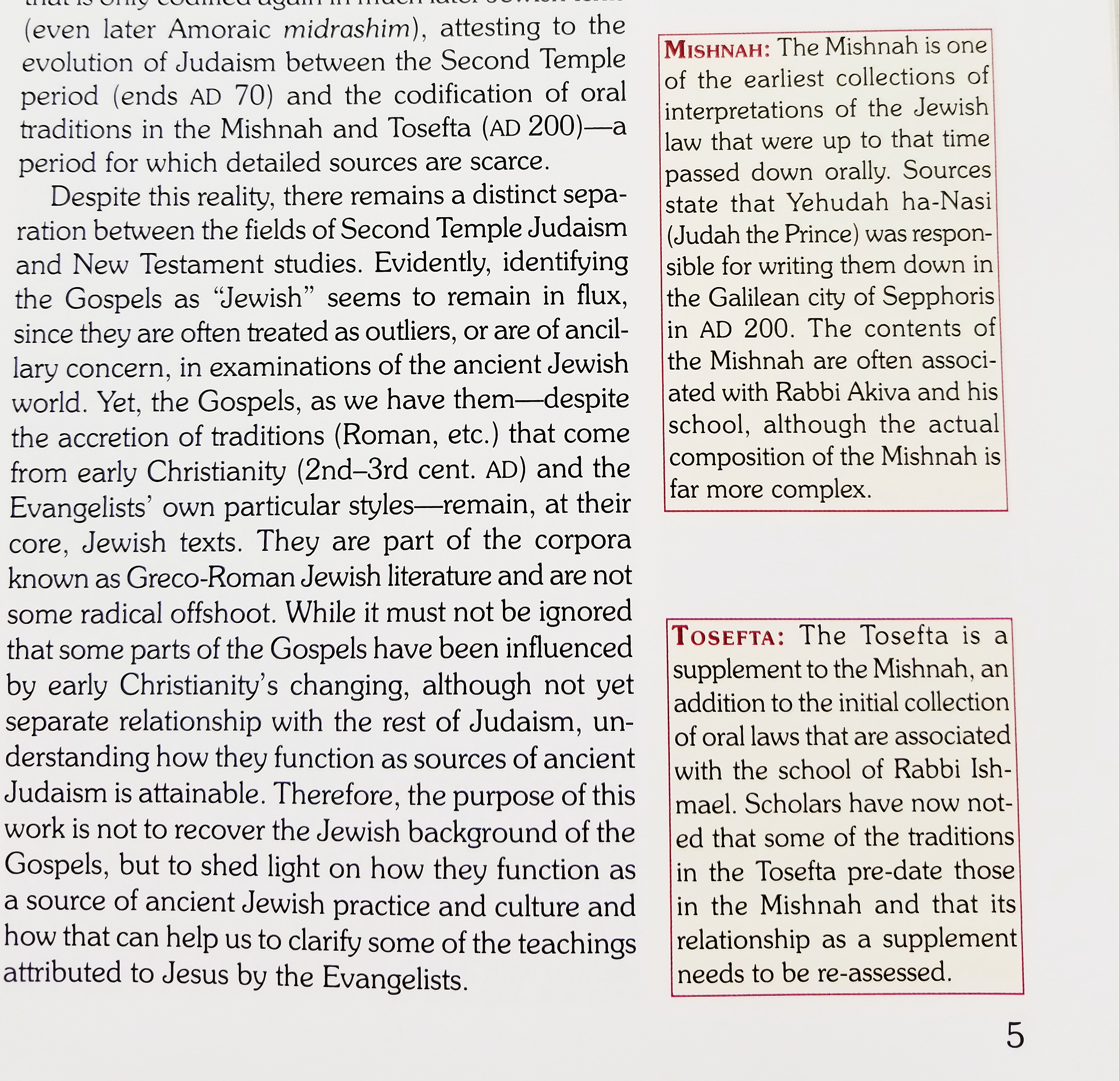 One impressive feature of Understanding the Gospels as Ancient Jewish Literature is how it lays out the basic information about ancient Jewish literature in a way that is accessible to those unfamiliar with it, such as students. For example, there are several text boxes set apart from the main text that give brief summaries on the Apocrypha, the Pseudepigrapha, extra-biblical texts, as well as early rabbinic material such as Tannaitic Literature, Amoraic Midrashim, the Mishnah, and the Tosefta.