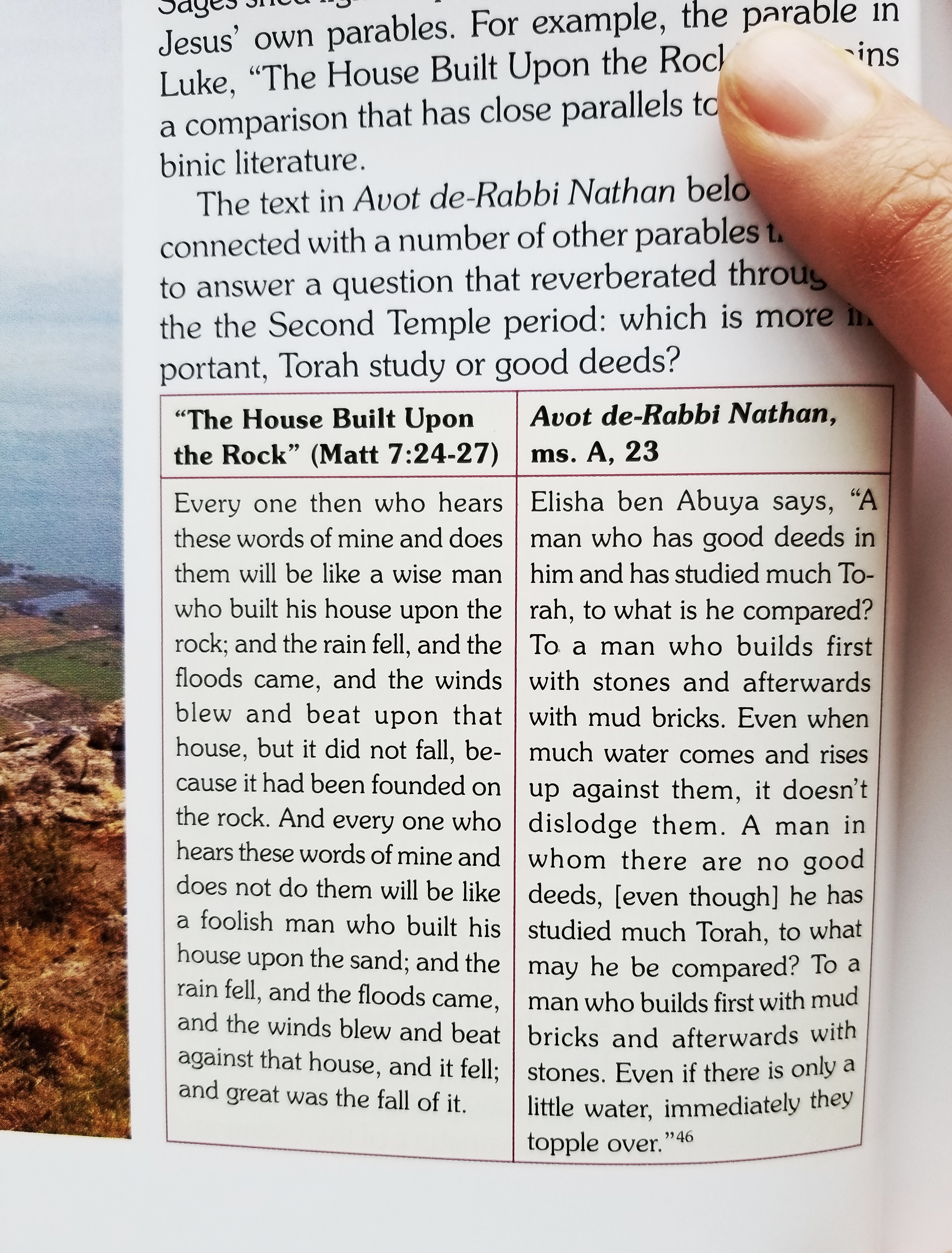 The title Understanding the Gospels as Ancient Jewish Literature does a good job of communicating the fact that García is both illuminating the content of the Gospels by showing how they fit within the context of Jewish life and literature at the time and using the Gospels as a source for ancient Judaism. For example, by reading Jesus’s parable of “The House Built Upon a Rock” in Matthew 7:24–27 in conjunction with a strikingly similar version in Avot de-Rabbi Nathan, we learn that the original Jewish context for this parable was a debate about which was more important: good deeds or Torah study. In the Avot de-Rabbi Nathan version, the man who builds his house upon a rock has good deeds and studies much Torah, while the man who uses mud bricks for his foundation is one who studies much Torah but has no good deeds. Jesus begins his parable, “Everyone then who hears these words of mine and does them…” (emphasis mine). Read in light of the parallel parable, we see that Jesus is equating his words with Torah and applying the same standard to them as was applied to the Torah: it is not enough to hear what Jesus says—you must put it in action.